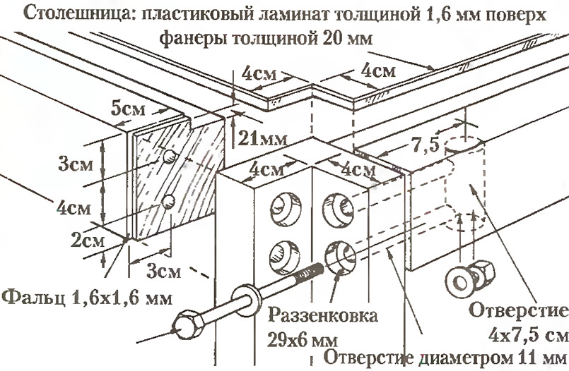 Фанерную столешницу выпилите со сторонами меньше заданных на 3 мм, чтобы между ее краями и каркасом остался зазор 1,5 мм. Столешницу покрывают пластиковым ламинатом.